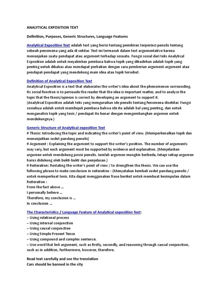 The difference of analytical and hortatory exposition is on the term of its generic. Analytical exposition text can be found in legal defenses, spoken arguments, advertisement,. Identify the generic structure of the analytical exposition text write an analytical exposition text. Teks eksposisi analitis social function, structure text, language features of analytical exposition contoh teks eksposisi analitis example . Example of analytical exposition text.